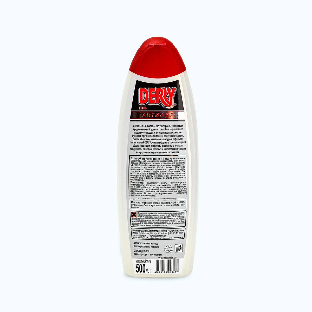 DERRY Гель — Антижир — универсальный продукт, специально разработанный для всех видов поверхностей (плита, духовка, вытяжка, гриль, барбекю, микроволновые печи, кафельная плитка и др). Легко и эффективно очистит Вашу поверхность от любых видов загрязнений, включая пригоревший жир и нагар, при этом не царапая и не повреждая покрытие. После использования легко смывается и не оставляет разводов на поверхности.