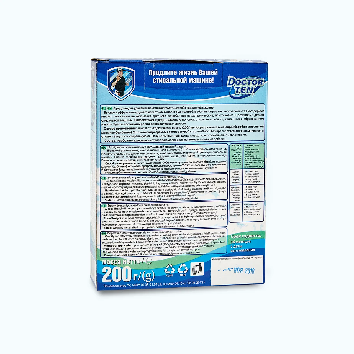 Doctor TEN — средство, которое не смягчает воду, а полностью удаляет известковый налет и остатки нерастворенных моющих средств из полости стиральной машины. Средство абсолютно безвредно для стиральных машин, так как не содержит кислот и не оказывает вредного воздействия на металлические, пластиковые и резиновые детали стиральной машины. Данное средство не является смягчителем воды и не добавляется при стирке. В период между его использованием применение всевозможных смягчителей не обязательно.