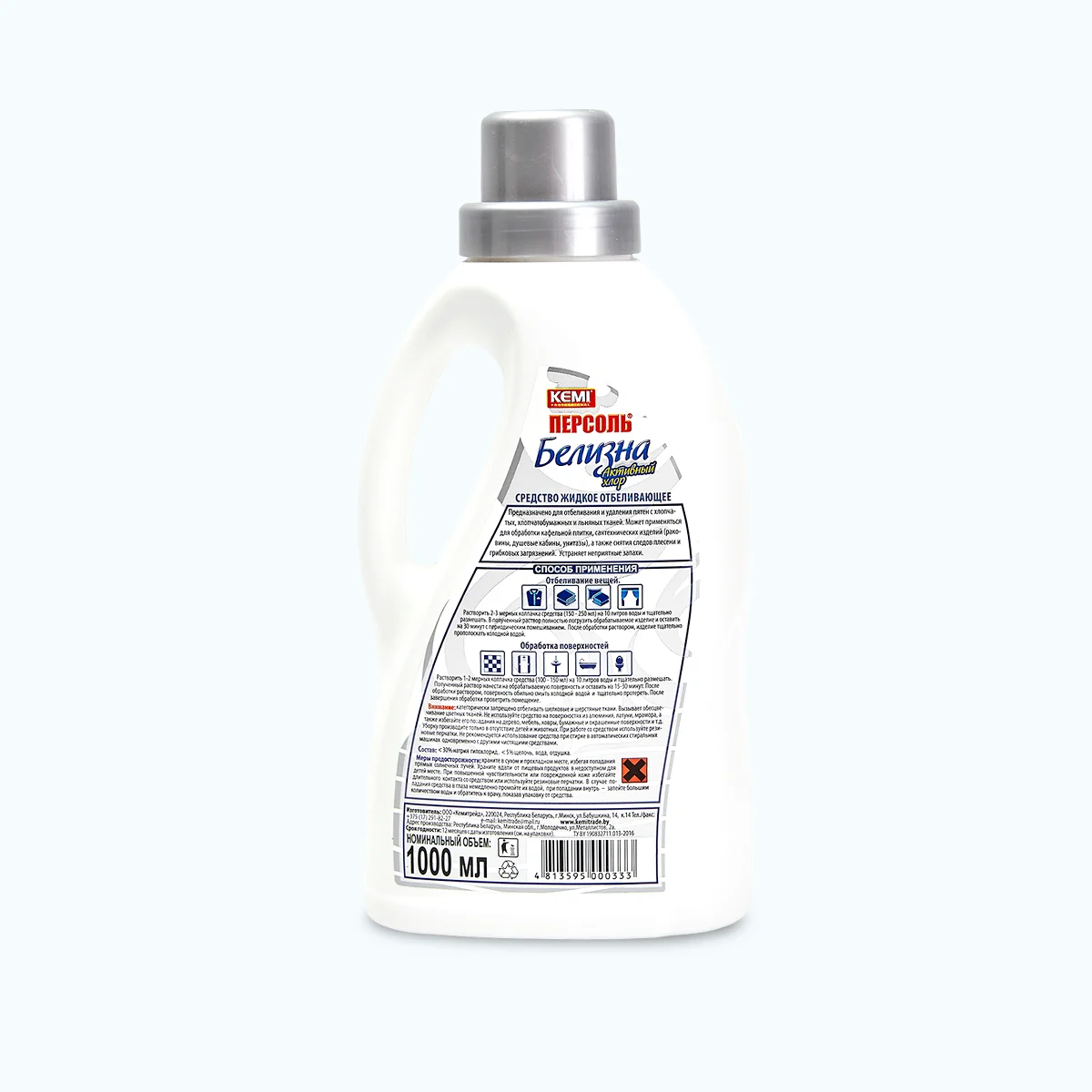 ПЕРСОЛЬ — Белизна Активный хлор — средство жидкое отбеливающее, предназначенное для отбеливания и удаления пятен с хлопчатых, хлопчатобумажных и льняных тканей. Может применяться для обработки кафельной плитки, сантехнических изделий (раковины, душевые кабины, унитазы), а также снятия следов плесени и грибковых загрязнений. Устраняет неприятные запахи.