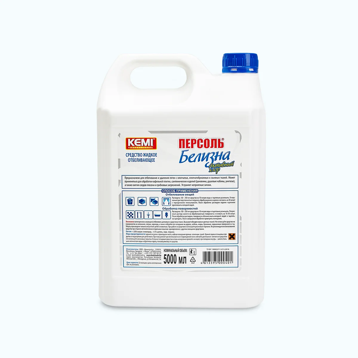 ПЕРСОЛЬ — Белизна Активный хлор — средство жидкое отбеливающее, предназначенное для отбеливания и удаления пятен с хлопчатых, хлопчатобумажных и льняных тканей. Может применяться для обработки кафельной плитки, сантехнических изделий (раковины, душевые кабины, унитазы), а также снятия следов плесени и грибковых загрязнений. Устраняет неприятные запахи.